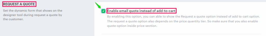 4. Scroll down to find Request a quote and enable the checkbox of Enable email quote instead of add to cart.