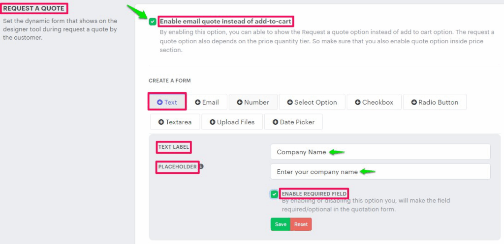 5. In Create a form section, you can create a form that will be required to fill up while requesting a quote from the designer tool. In the Text Label, you can give a name to the text box, and in the Placeholder, define the name of the input field of the text box.