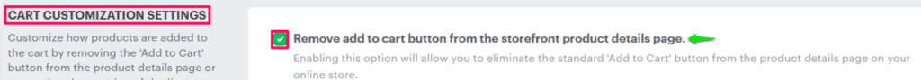 4. Scroll down to find Cart Customization Settings and enable the checkbox to the Remove add to cart button from the storefront product details page.