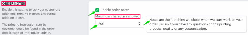 4. Scroll down to find Order Notes, and select the checkbox to Enable Order Notes. Under Maximum Characters Allowed, set the character length. (Your users can add notes only up to the character length you have set.)