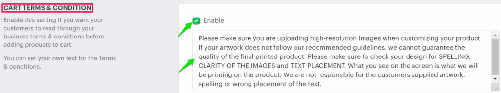 4. In the Cart Terms & Condition section, enable the option and enter your description for the terms and conditions of the add to cart.