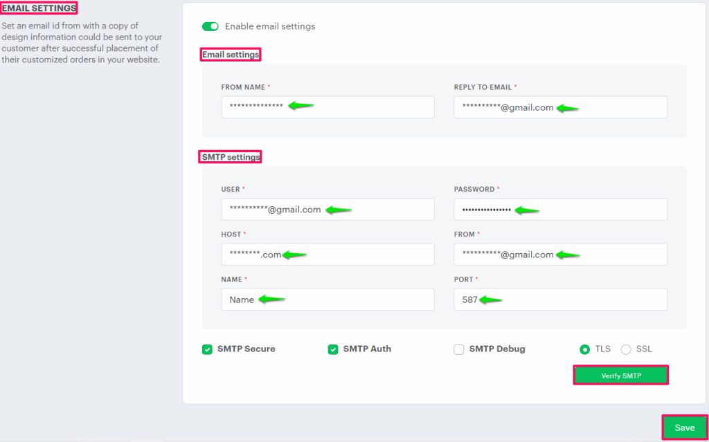 5. Enter the details in the Email settings and SMTP settings. Click the “Verify SMTP” button to verify whether the details are correct or not. You will receive an email if the settings are correct.