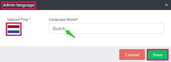 5. A pop-up named Admin Language appears. Click the box under Upload Flag to upload your country’s flag, enter the language name, and click “Save.”