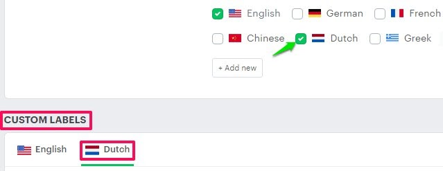 6. Enable the checkbox for the added language. A new tab will be created under the Custom Labels section.