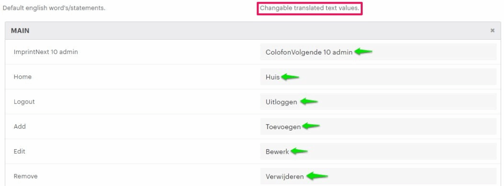 7. Click each module (Main, Feature, Clipart, etc.) and enter your translated language in the column Changeable Translated Text Values.