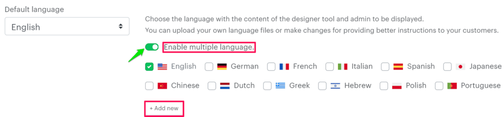4. Move to the right, toggle the button to Enable Multiple Languages, and click “Add New.”