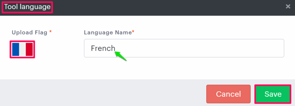 5. A pop-up named Tool Language appears. Click the box under Upload Flag to upload your country’s flag, enter the language name, and click “Save.”