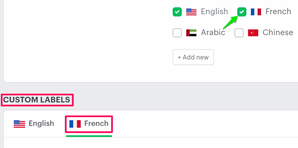 6. Enable the checkbox of the added language. A new tab will be created under the Custom Labels section.