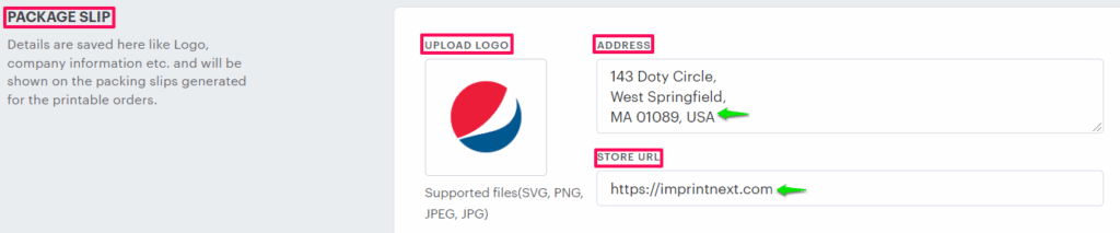 4. From the Package Slip section, enter the company information, such as Company Logo, Address, and Store URL, that will be shown on the packing slip generated for printable orders.