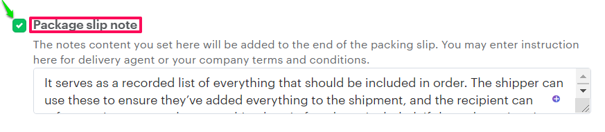 5. Enable the checkbox of Package Slip Note to set notes/instructions for the delivery agent. You can write the notes in the text area, and they will be added to the end of the packing slip.