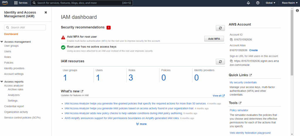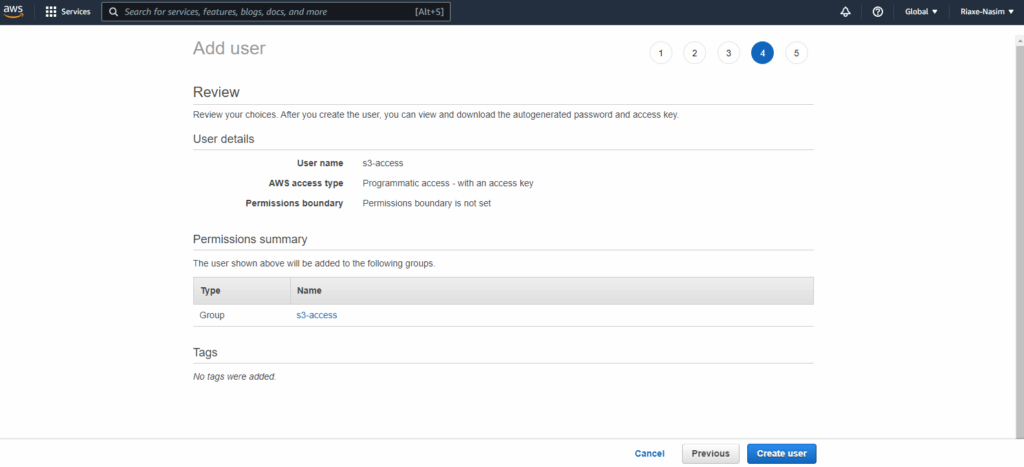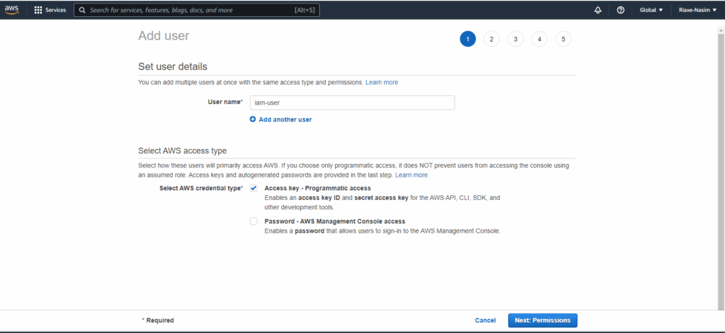 - Create an IAM user with the necessary permissions. While a root account can also be used, it’s recommended to have the highest permissions and avoid using it in a production environment.
