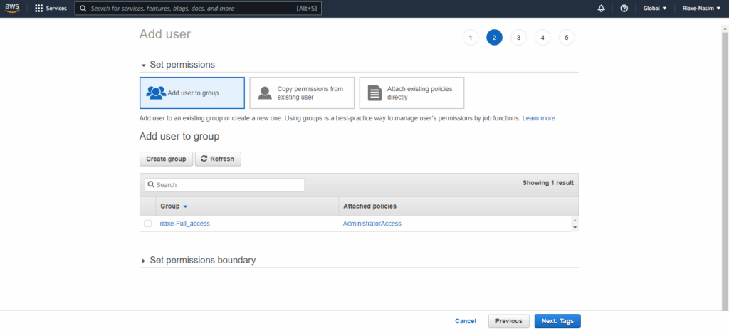 9. In the Create group dialog box, for Group name, enter your group name for that user. Example: “s3-admin-group”.
