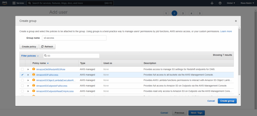 11. In the policy list, select the check box for AWS S3 Full Access. Then choose Create group.