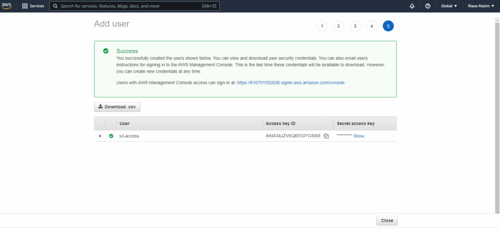 14. After the user is created, the next important step is to download the CSV file containing the Access key and Secret key for programmatically accessing the S3 Bucket.