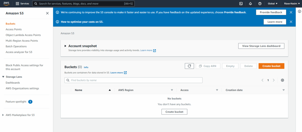 2. Choose “Create bucket”. The Create bucket wizard opens.