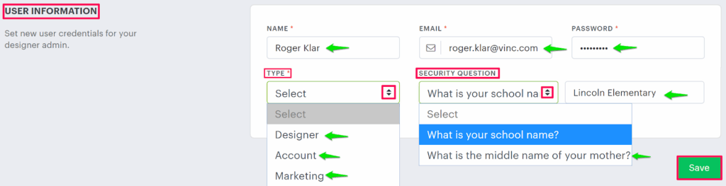 4. Under the User Information section, set user information like name, email, password, type, security question, and security answer.