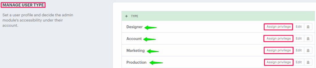 4. Under the Manage User Type, choose any user type and click “Assign privilege.”