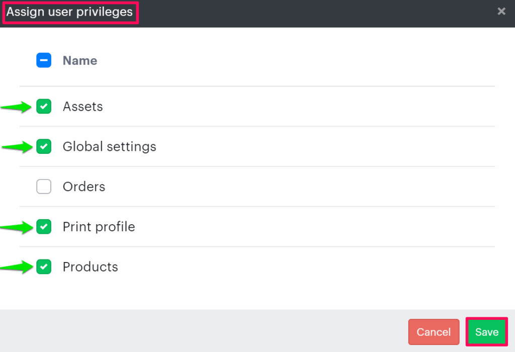 5. A pop-up named Assign user privileges will open. Select the desired privilege you want to assign.