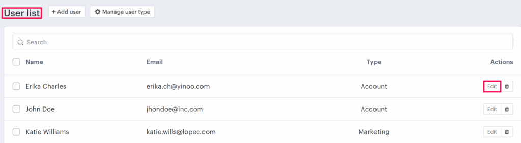 3. In the User list page, the list of users will show below. Choose any user and click “Edit”, which is below the Actions panel.