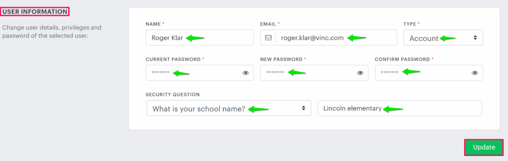 4. Under the User Information section, edit the properties of selected users such as name, email, type, password, security question, and security answer.