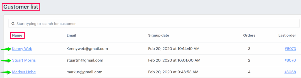 4. In the Customer list page, the list of registered customers will show. Under Name, click your desired customer.