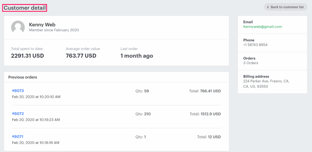 5. Under Customer detail, you can view the customer details like (previous orders, total spent to date, phone, billing address, etc.)