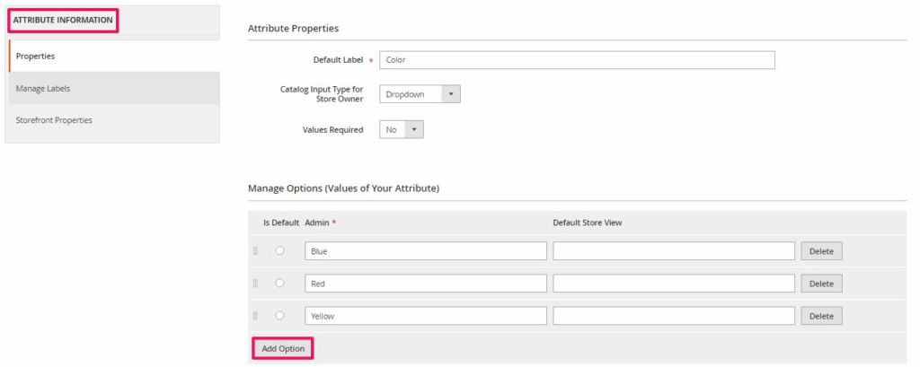 4. In Attribute Information, select the Properties Tab. Scroll down to the bottom and click “Add Option.”