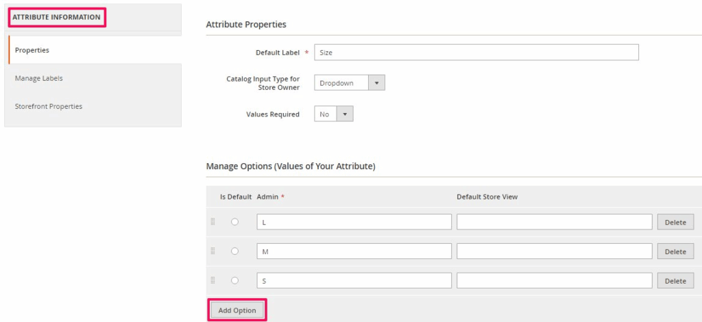 4. In Attribute Information, select the Properties Tab. Scroll down to the bottom and click “Add Option.”