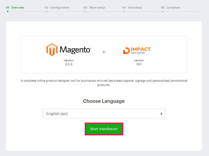 5. In the first step, you will see your E-Commerce platform and the Impact Designer version. Choose your preferred language for the installation, then click “Start Installation” to proceed to the next step.