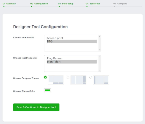14. In this step of Tool Setup, select your desired printing method from Choose Print Profile. Then select the product from Choose Test Product(s). The demo products and print profile will be created in your Impact Designer. You can also edit and delete them later.