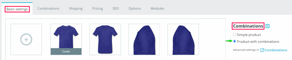 3. In the tab Basic settings, move to the right and select Product with combination.