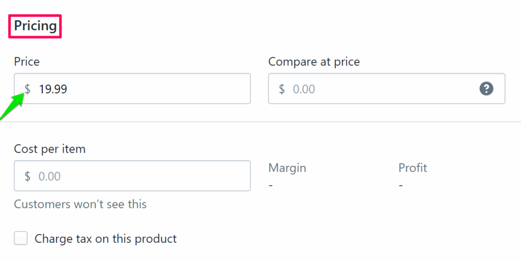 - Scroll down and go to Pricing to enter the price of your product.