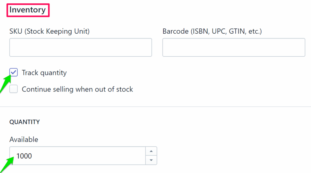- Scroll down and go to Inventory. Enable the checkbox of Track Quantity and set the quantity.