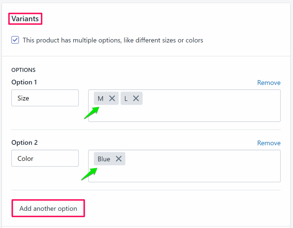 - Enter size values. Click “Add Another Option” again to add color values.