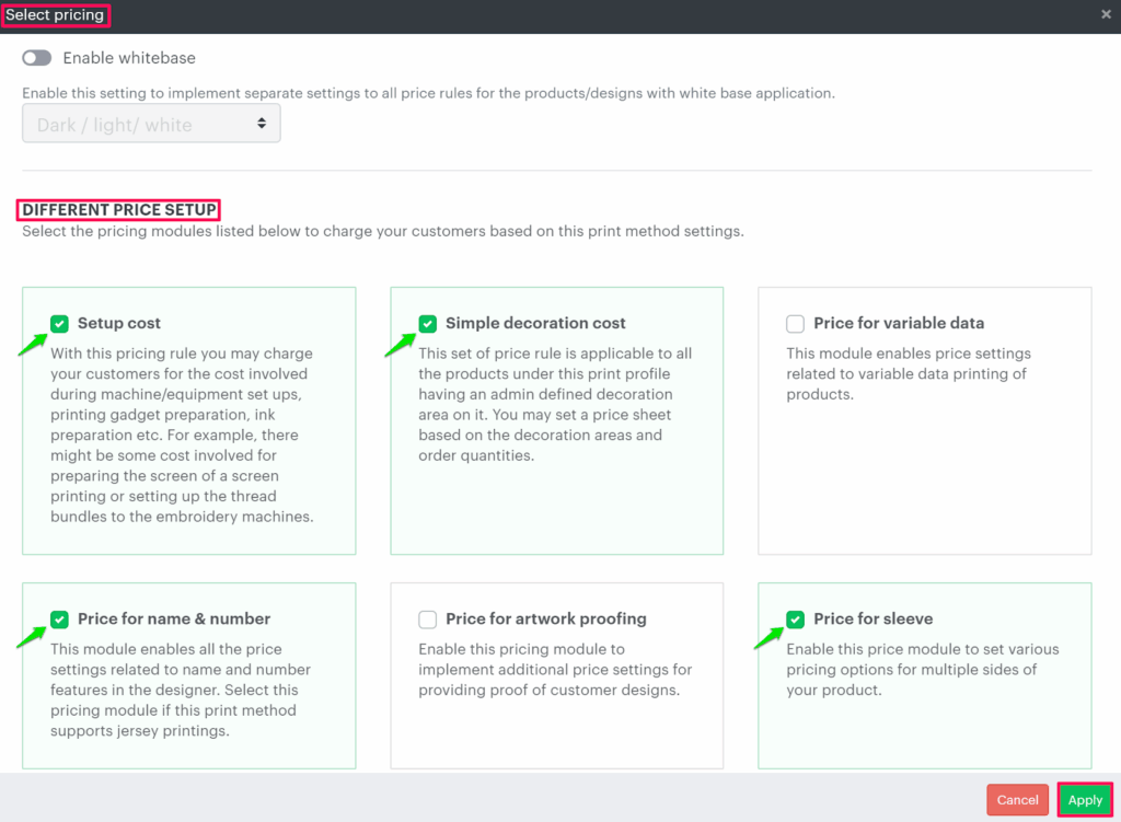 6. A pop-up named Select Pricing will appear. Under Different Price Setup, select your price modules.