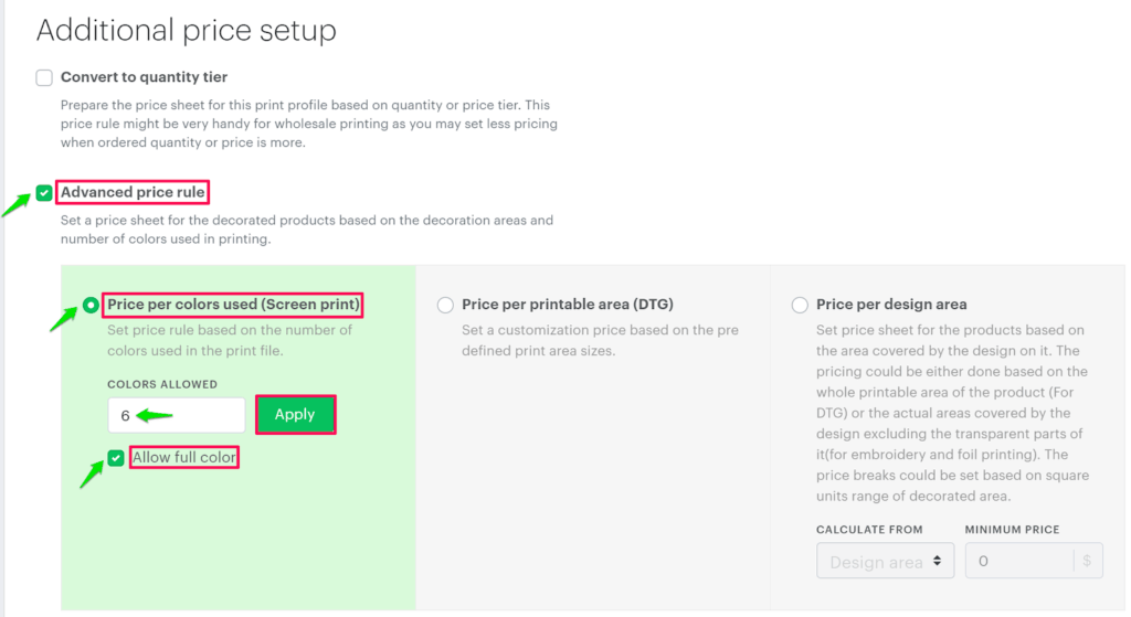 • Click the radio button Price per Color Used (Screen Print), enter the value for the number of colors allowed, and tap “Apply”