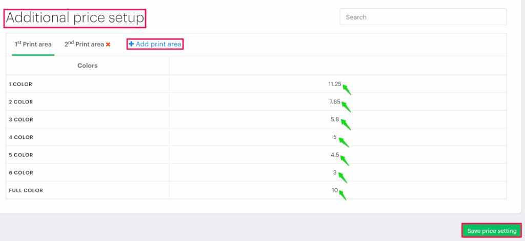 10. To configure prices for more print areas, click “Add Print Area”
