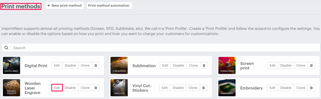 3. In the Print methods page, select your print method and click “Edit”