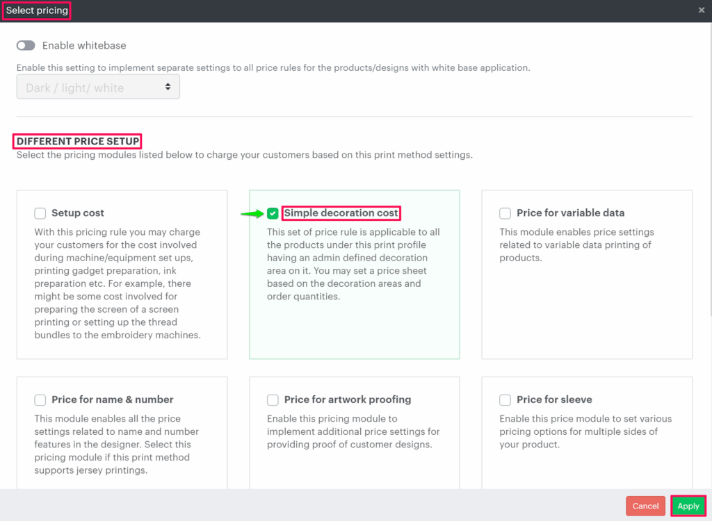 6. A pop-up named Select pricing appears. Under the Different price setup, select the Simple decoration cost checkbox and click “Apply”