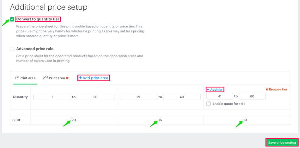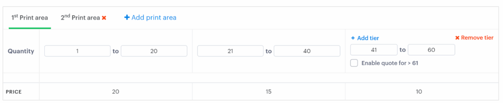 - To configure the price for a larger print area, click “Add print area”