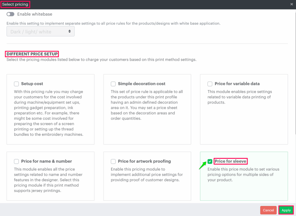 6. A pop-up named Select pricing appears. Under Different Price Setup, select the Price for sleeve checkbox and click “Apply”