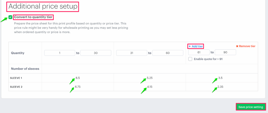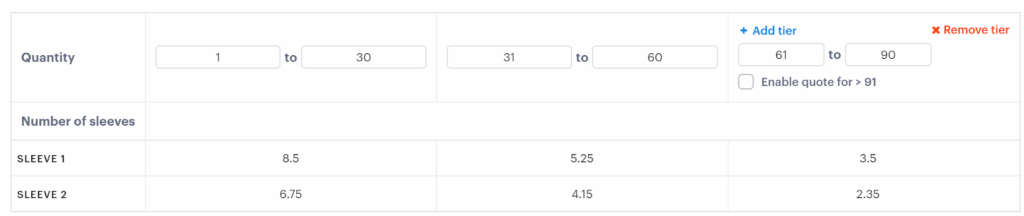 The tier price table offers you to configure the price based on order quantity and the number of sleeves in the product. The objective of this price sheet is “the more items you purchase, the lower the per-item price.”