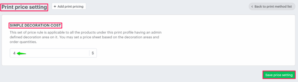 7. Under the Simple Decoration Cost, give your price in the text box. Then click “Save price setting”
