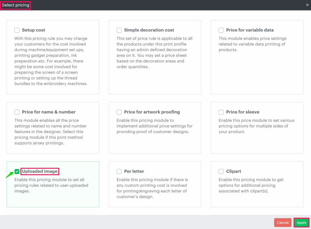 6. A pop-up named Select pricing appears. Scroll down to select the Uploaded images checkbox and click “Apply”