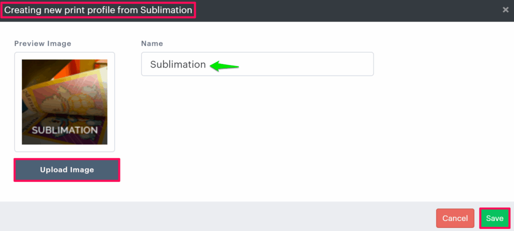 4. A pop-up named Creating new print profile appears. Click “Upload Image” to upload print profile images and enter the name of the print profile.