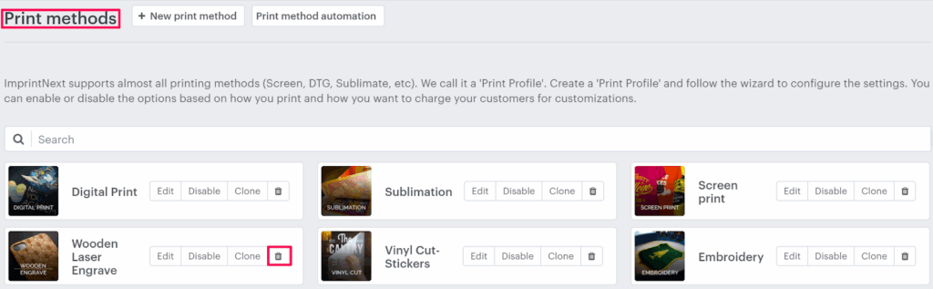 3. In the Print Methods page, select your print method and click on the delete icon.