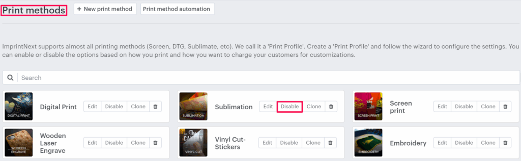► While assigning print methods to products or assets, the disabled print methods will not be displayed.