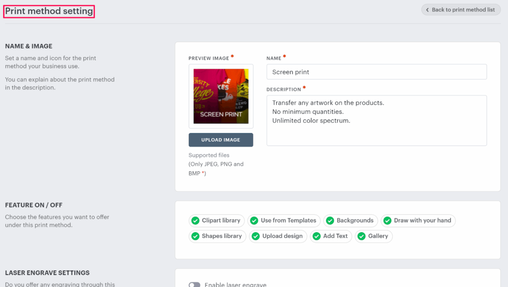 4. The Print method setting page will appear, and make your desired changes.