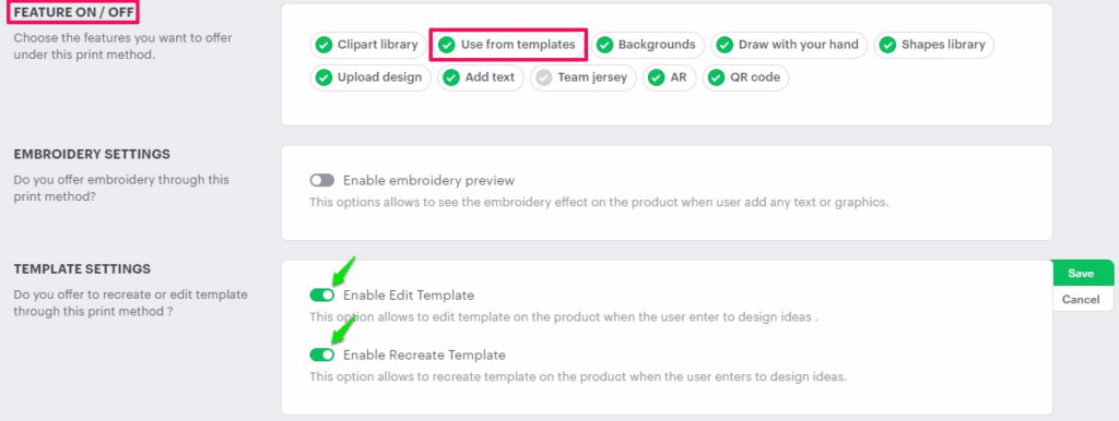 5. In the Template Settings section, enable the toggle for Enable Edit Template or Enable Recreate Template to show the feature in the designer tool.