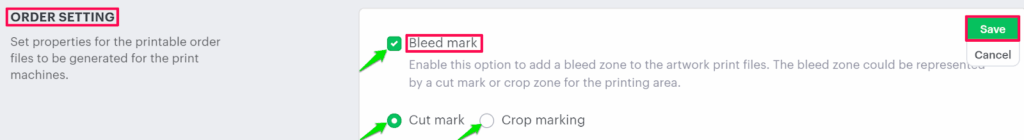 4. The Print method setting page will appear, and scroll down to find Order settings. Move to the right and select the checkbox for Bleed mark, and select your desired option for the print files.